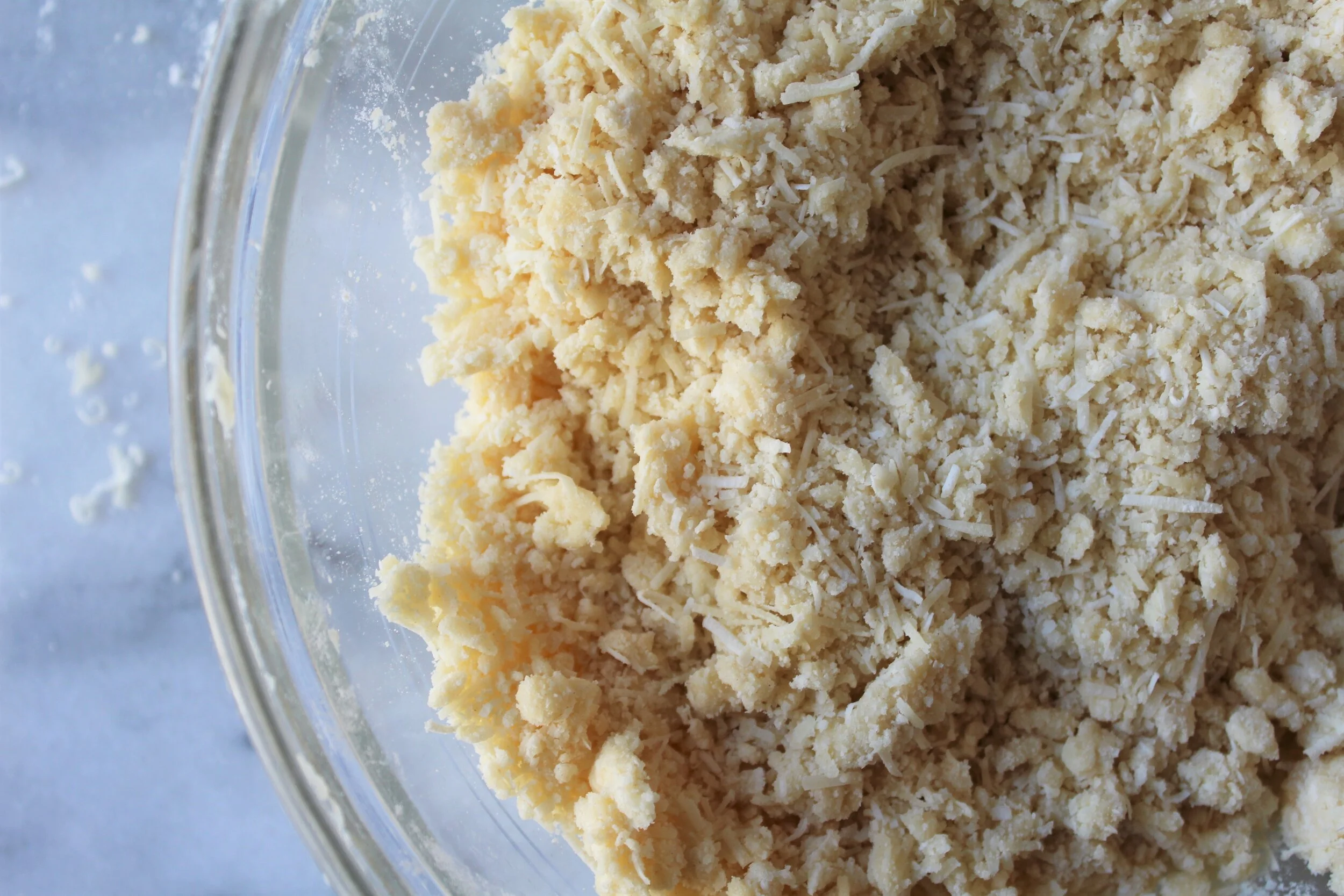 In a bowl, stir together the flour, cheese, and salt. With a fork, pastry cutter, or your fingertips, blend in the butter until the mixture is course crumbs. Add in the processed walnuts and stir to combine.