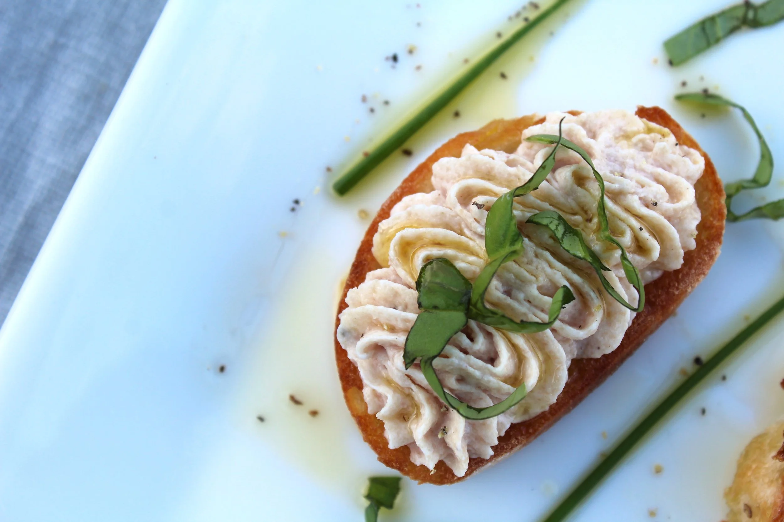 Preparation - Add all ingredients into a food processor and process until desired creaminess. Add additional ½ & ½ if desired. Top toasts with spread and garnish with pepper and basil
