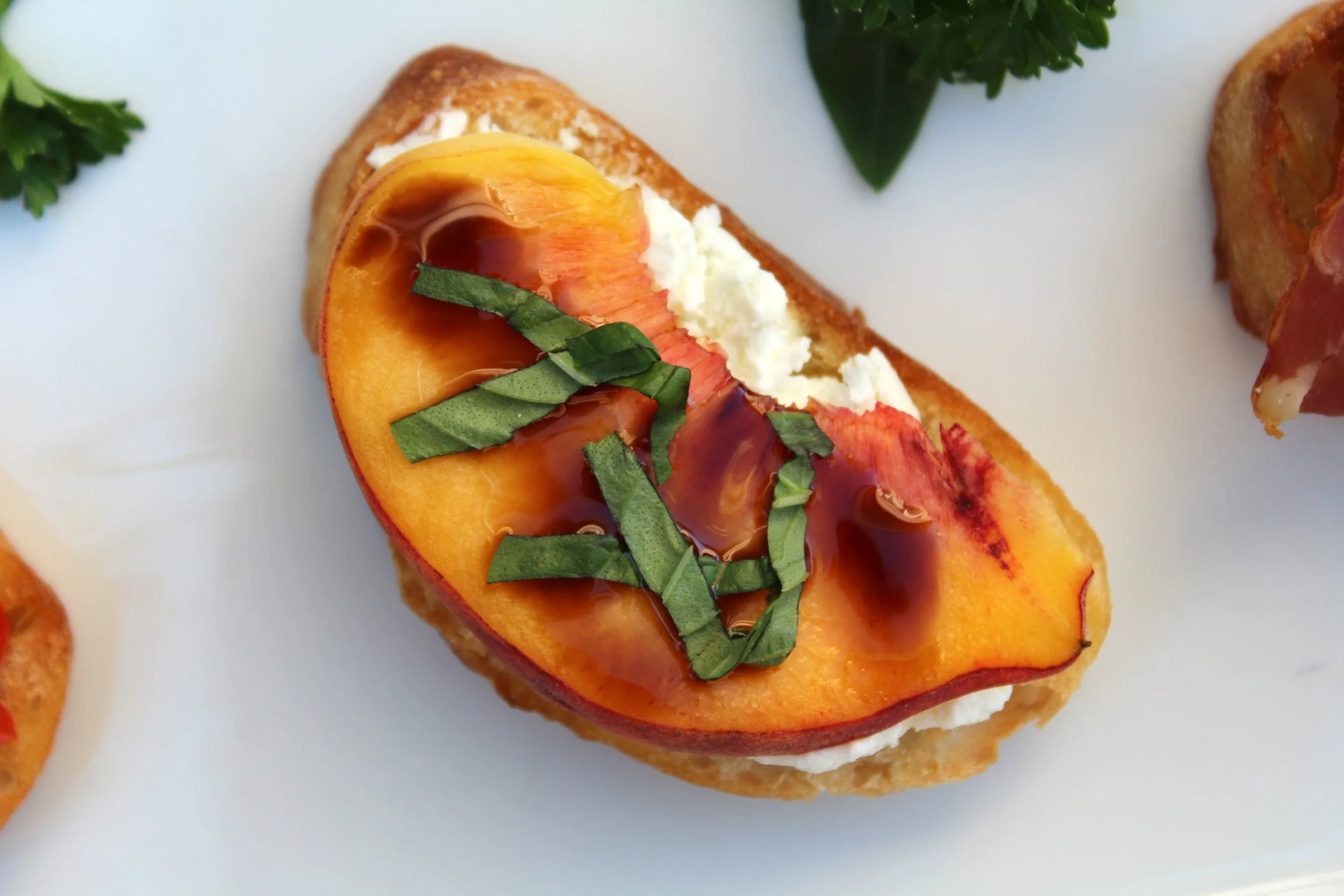 Preparation - Spread Chevre on toasts, top with sliced peach, fresh basil and a drizzle of balsamic.*The BV glaze is made to be just a bit thicker and sweeter than regular balsamic and is nicer for a garnish. Either can be used though.