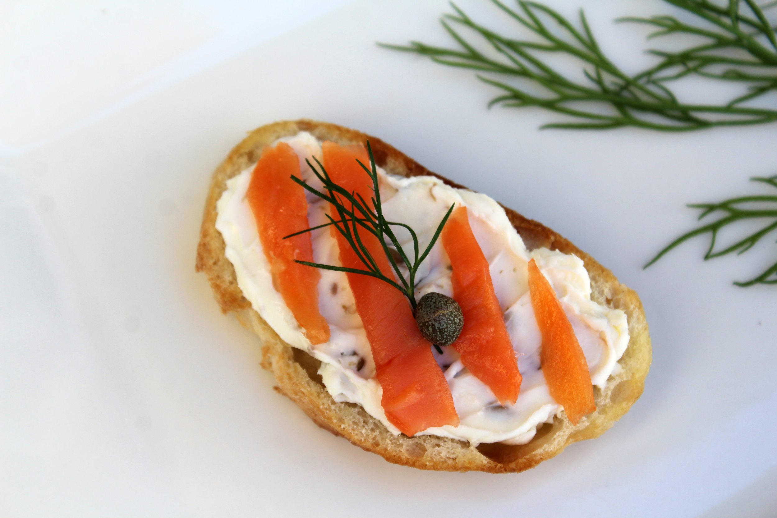 Preparation - Mix the cream cheese with the minced capers (this can be adjusted depending on the saltiness of the capers.) Spread cream cheese mixture on toasts and top with slices of the salmon. Garnish with a caper and dill.